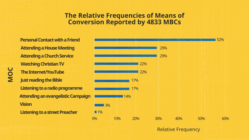 My research which draws on responses from 4,833 Muslim Background Christians (MBCs) indicates that the majority came to faith through personal interaction with Christians. As illustrated in the accompanying graphic showing the relative frequencies of reported Means of Conversion (MOC), relational engagement plays a central role in journeys to Christ. Within this context, Ramadan represents a significant opportunity for meaningful interaction with Muslims and for initiating conversations about Jesus.