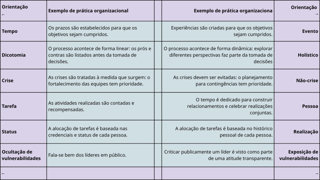 As dimensões culturais mencionadas acima também podem ser usadas para descobrir nossa cultura organizacional e determinar o quanto ela é dominada por uma determinada cultura. Para concretizar esse pensamento, seguem algumas práticas organizacionais relacionadas a cada dimensão cultural na tabela a seguir.